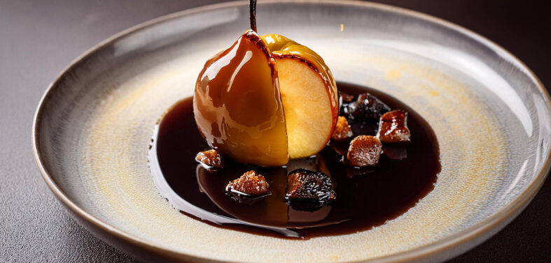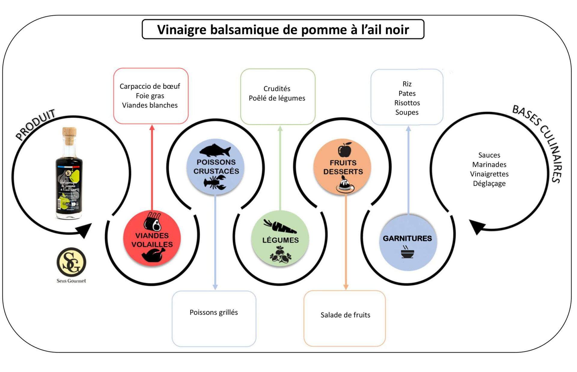 Découvrez le balsamique de pomme à l’ail noir. Produit avec des pommes exclusivement d’origine Normande et de l’ail des Causses, ce vinaigre est obtenu par une réduction de jus de pomme et de vinaigre de cidre macéré dans de l’ail noir.