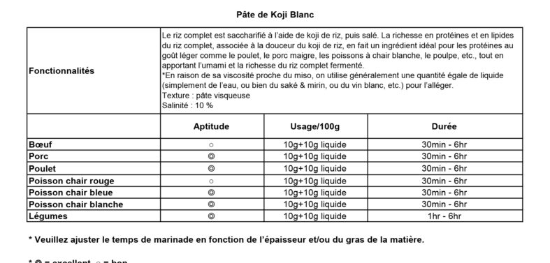 Obtenu par saccharification du riz complet avec du koji de riz, puis légèrement salé (10 %), cet ingrédient unique révèle toute la richesse du riz complet alliée à la douceur du koji. Sa texture de pâte onctueuse et sa profondeur en umami en font un allié idéal pour sublimer les viandes maigres (poulet, porc, poissons blancs, poulpe…).